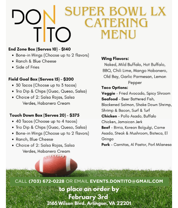 Want to celebrate the Big Game from your couch? We’ve got the food covered. Don Tito’s Game Day Catering Boxes are loaded with fan-favorite bites and made fresh for pickup only at 3165 Wilson Blvd in Arlington, VA.